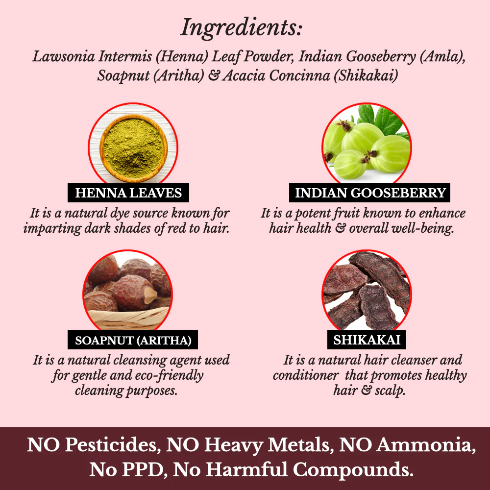 - Chemical-Free & Freshness Guaranteed: No Pesticides, No Heavy Metals, No Ammonia, No PPD, No Harmful Compounds, ensuring a clean and natural haircare experience. The product comes in beautiful Double Sealed Tin Boxes to preserve freshness and prevent lumping.