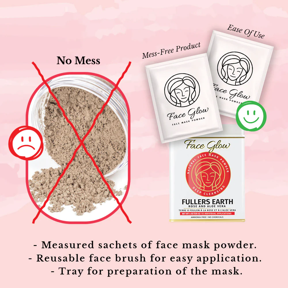 Face Glow- Fuller’s Earth w/ Rose & Aloe Vera- 12 Individual Sachets of Multani Mitti (10 gm each)- Reusable Brush & Tray Included